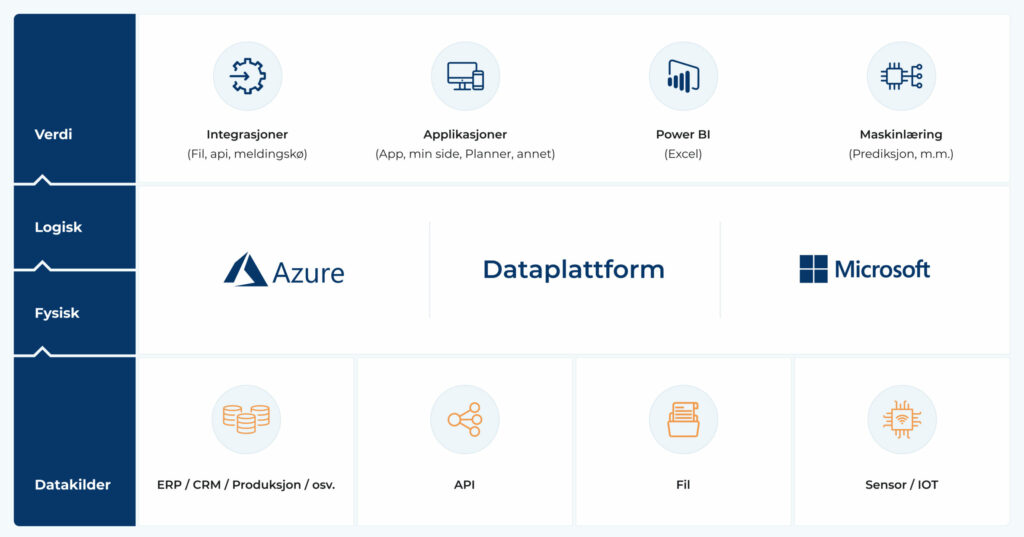 Dataplattformen tilrettelegger for tilgjengeliggjøring, sammenstilling, kvalitet og strukturering av informasjon, samtidig som at sikkerhet og GDPR ivaretas. Våre kunder benytter seg ofte av en slik plattform som kilde for Power BI løsninger.