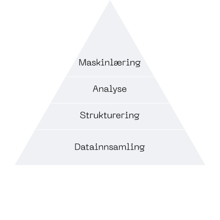 En av prinsippene vi tar utgangspunkt i illustreres med en pyramide, hvor hvert lag avhenger av laget under. Maskinlæring er ikke en magisk vitenskap som løser alle problemer, men som avhenger av tilgjengelighet på strukturert data og domenekunnskap for å kunne hente ut størst potensiale.